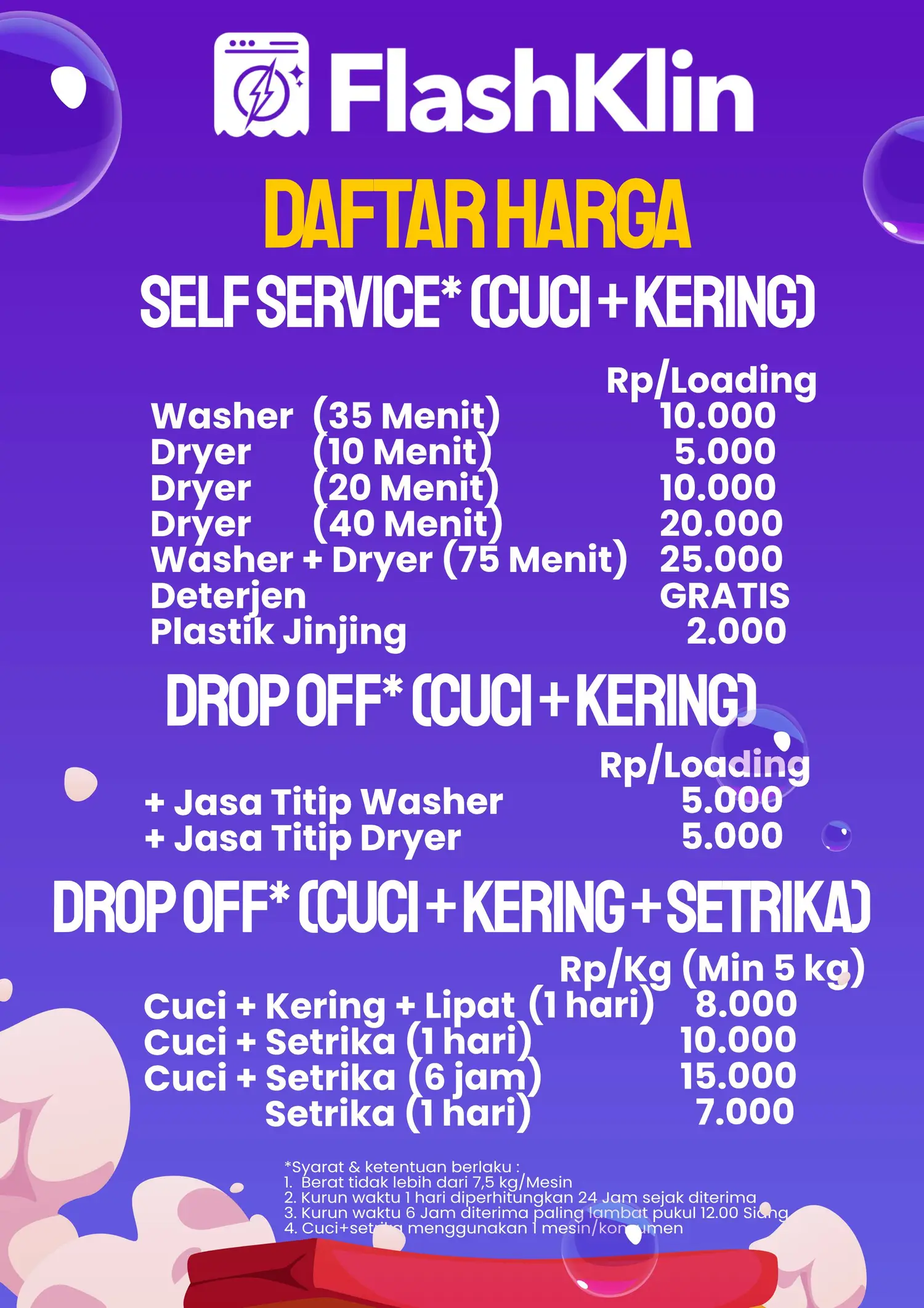 Di FlashKlin, kami memahami betapa berharganya waktu Anda. Itulah mengapa kami menawarkan layanan self-service laundry cepat yang memastikan pakaian Anda bersih dan rapi dalam waktu singkat. Dengan peralatan modern yang mudah digunakan dan fasilitas yang nyaman, Anda dapat mencuci dan mengeringkan pakaian sendiri dengan mudah. Nikmati kebebasan mengatur waktu dan proses laundry Anda sendiri di FlashKlin, tempat laundry terpercaya di Banjarbaru